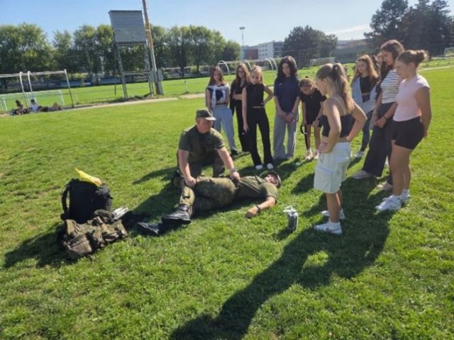 Ukážky vojakov 11. brigády Vzdušných Síl Nitra na zdravotníckej škole v Nitre V spolupráci so Strednou zdravotníckou školou v Nitre sa v doobedňajších hodinách dňa 4. augusta 2025 uskutočnil branno-športový deň, na ktorom mali študenti možnosť bližšie spoznať prácu profesionálnych vojakov. Cieľom aktivity bolo priblížiť mladým ľuďom špecifiká vojenskej služby, jej zameranie a náročnosť. Súčasťou programu boli dynamické ukážky služobnej kynológie. Psovodi demonštrovali zásahy služobných psov proti páchateľovi a prácu v rôznych modelových situáciách. Žiaci mali možnosť na vlastné oči vidieť koordináciu človeka a zvieraťa pri špeciálnom výcviku, ktorý je neoddeliteľnou súčasťou bezpečnostných zložiek. Na podujatí mohli študenti navštíviť celkovo dvanásť stanovíšť, na ktorých si mohli zlepšiť teoretické i praktické zručností vo viacerých oblastiach. Pre študentov boli pripravené aj dve súťažné stanovištia. Prvé zo stanovíšť bolo zamerané na prvú pomoc v poľných podmienkach, kde si študenti mohli preveriť svoje zdravotnícke zručnosti a naučiť sa, ako správne reagovať pri zraneniach v bojových podmienkach či krízových situáciách. Druhé stanovište sa venovalo výzbrojným a výstrojným súčiastkam, RCHBO a zbraňovým systémom. Žiaci tak získali prehľad o technickej výbave vojakov, spôsobe jej používania a dôležitosti ochrany v rizikovom prostredí. Podujatia sa aktívne zúčastnili žiaci 1. a 2. ročníka, ktorí sa zapájali do praktických ukážok, diskutovali s príslušníkmi 11. brigády Vzdušných síl Nitra a kládli otázky týkajúce sa ich profesionálnej služby. Aktivita priniesla študentom nielen zážitok, ale aj cenné vedomosti, ktoré môžu mladým ľuďom pomôcť pri rozhodovaní o budúcej kariére a zároveň prehĺbiť ich povedomie o význame ozbrojených síl v spoločnosti.
